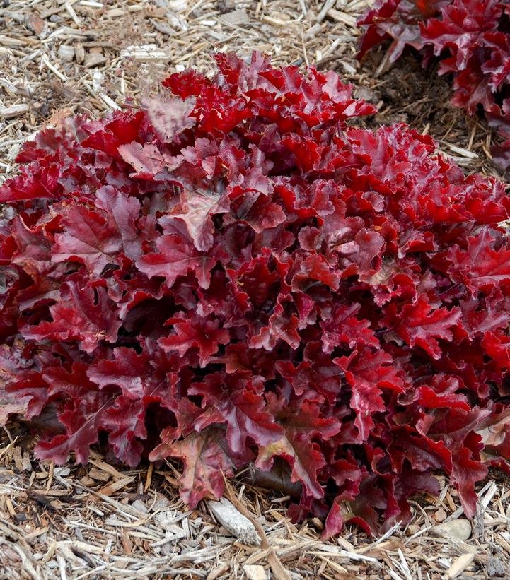 Beautiful bright red, heavily ruffled leaves for a low, mounding habit. In summer, color matures to rich mahogany red. Light pink flowers. Perfect in part shade or shade.