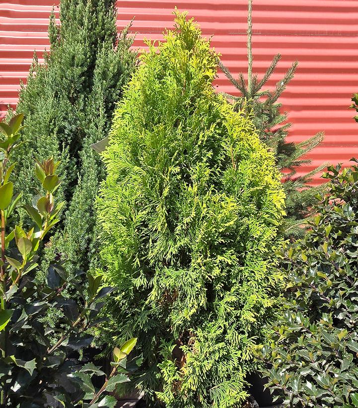 Description: Great texture Yellow edging to lime-green foliage Color matures to amber-gold Great focal point or privacy screen evergreen Well-behaved growth habit Low maintenance